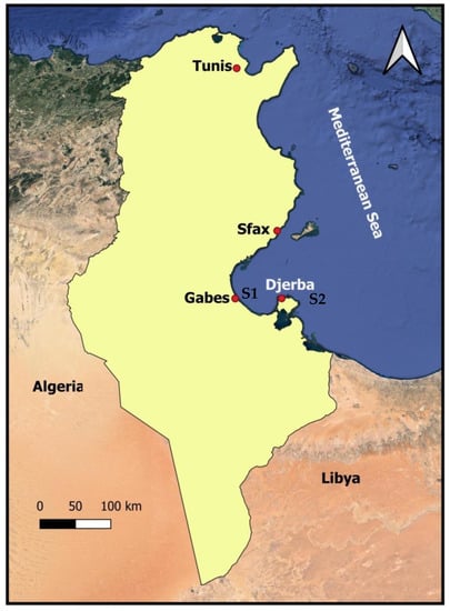 The selection of sampling sites is a critical stage of any pollution impact assessment. For this purpose, two sites belonging to the Gulf of Gabès were selected, with different degrees of contamination (Figure 1):