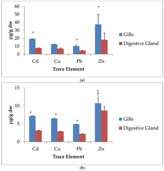 Trace element contents (µg/g dry weight) in the gills (a) and the digestive glands (b) between the two studied sites (n = 20). *: statistically significant difference for the metal contents between the two sites (p < 0.01).