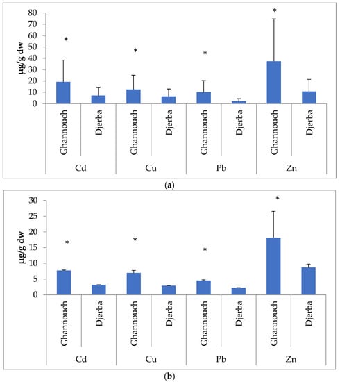 Heavy metal content s(Cd, Cu, Pb, and Zn) in P. Segnis tissues (n = 20) from Ghannouch site (a) and from Djerba site (b). *: statistically significant difference between the trace element contents in the gills and hepatopancreas (p < 0.01).