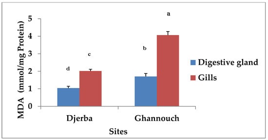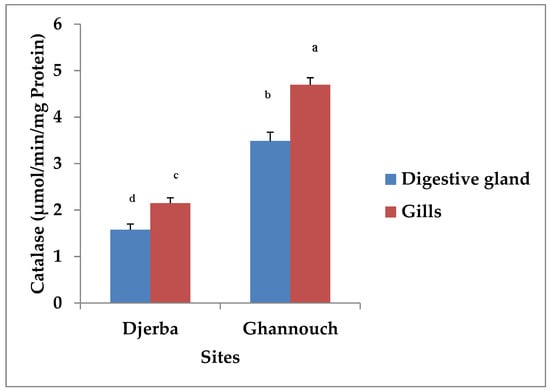 Figure 3a reveals that the highest concentrations in the gills were found in the individuals collected from Ghannouch, near the industrial zone of Gabès, for the four studied metals, Cd (19.21 ± 0.1 µg/g), Cu (12.53 ± 0.078 µg/g), Pb (10.15 ± 1.38 µg/g), and Zn (37.36 ± 12.57 µg/g) compared to the values noted in the individuals coming from Djerba, which were Cd (7.2 ± 0.049 µg/g), Cu (6.458 ± 0.122 µg/g), Pb (2.212 ± 0.054 µg/g), and Zn (10.722 ± 2.9 µg/g). For the values obtained from the hepatopancreas, the individuals from the Ghannouch site also presented the highest levels (Figure 3b) of metallic trace elements, Cd (7.74 ± 0.14 µg/g), Cu (6.96 ± 0.79 µg/g), Pb (4.536 ± 0.24 µg/g), and Zn (18.14 ± 8.38 µg/g), in comparison with the contents in the tissues of the individuals from Djerba, Cd (3.18 ± 0.04 µg/g), Cu (2.91 ± 0.087 µg/g), Pb (2.212 ± 0.054 µg/g), and Zn (8.71 ± 1.03 µg/g). In fact, the statistical analyses between the two study stations showed statistically significant differences in gill levels for Cd (F = 23.32; p < 0.01), Cu (F = 92.35; p < 0.01), Zn (F = 62.24; p < 0.01), and Pb (F = 23.96; p < 0.01), as well as for the levels in the hepatopancreas for Cd (F = 74.39; p < 0.01), Cu (F = 17.11; p < 0.01), Zn (F = 54.31; p < 0.01), and Pb (F = 36.06; p < 0.01) (Figure 3a,b).