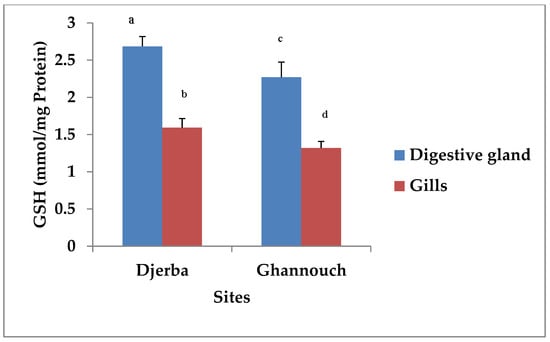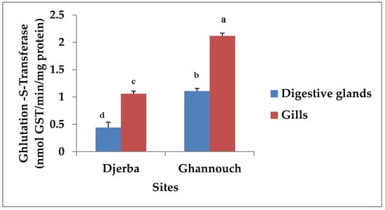 GST is an enzyme that aids in the detoxification of xenobiotics and/or protection against the toxic metabolites produced by the breakdown of macromolecules after exposure to oxidative stress. GSTs are phase II metabolic enzymes whose function is to conjugate to a glutathione molecule a wide variety of pollutants to allow for their elimination. These enzymes are therefore triggered by the presence of certain pollutants in the environment, such as metals, and are therefore considered biomarkers of pollution. In addition, the major role of GST is the mitigation of oxidative stress generated by trace metal elements (TMEs) [23]. The technique adopted used to assay GST activity was that of Habig et al. [24]. This consisted of presenting the enzyme contained inside the homogenate with a substrate (2,4-chloro dinitrobenzene (CDNB)) which reacts without problems with many forms of GST and glutathione. The conjugation reaction of these two products catalyzed by GST results in the formation of a new molecule, 1-glutathione-2,4-dinitrobenzene (GST-DNB), which absorbs light at a 340 nm wavelength. The value of the optical density measured is directly proportional to the amount of conjugate formed and is related to the intensity of GST activity. Assays were performed via the homogenization of 100 µL of the biological extract with 200 µL of 0.1 M NaPi (pH 6.5), 150 µL of 10 mM CDNB, and 900 µL of 10 mM glutathione. The obtained mixture was incubated at 37 °C, and then the absorbance was measured every minute at 340 nm with the extinction coefficient of 9.6 mM−1 cm−1. The specific activity of GST is expressed in nanomoles of CDNB per minute per milligram of protein (nmol CDNB/min/mg protein).