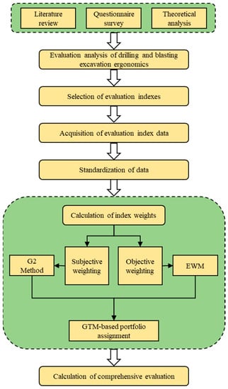 This paper establishes a game theory G2-EW-TOPSIS model based on the evaluation process of the excavation ergonomics of the drilling and blasting method, as shown in Figure 1. The steps can be described as follows: