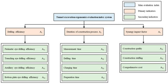 There are many factors affecting the excavation ergonomics of tunnel drilling and blasting method, such as drilling efficiency, construction time, and construction quality, and there is a complex non-linear relationship between the factors. Therefore, it is important to choose a reasonable evaluation index system for tunnel drilling and blasting method excavation ergonomics. The establishment of a systematic and complete evaluation index system is the basis for scientific evaluation; in the construction of tunnel drilling and blasting method of excavation ergonomics evaluation index system, this should follow the principles of being scientific, systematic, and comprehensive. In this paper, based on the review of relevant standards, literature, and field research [,,,,,,], a tunnel drilling and blasting method excavation ergonomics evaluation index system containing three primary indicators and 11 secondary indicators was established, as shown in Figure 2.