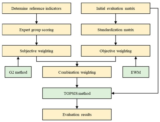 The commonly used methods for calculating index weights are subjective assignment and objective assignment. Among them, subjective assignment method relies excessively on experts’ experience, while objective assignment method relies heavily on the sample. It can be seen that a single assignment method has strong subjectivity or objectivity, and an effective combination of subjective and objective weights can further improve the accuracy of model weights. Therefore, in this paper, in order to improve the reliability of the evaluation results, GTM is selected to calculate the comprehensive weights of the evaluation indices, and TOPSIS method is used to achieve a comprehensive evaluation of the excavation ergonomics of tunnel drilling and blasting method. The specific steps are shown in Figure 3: