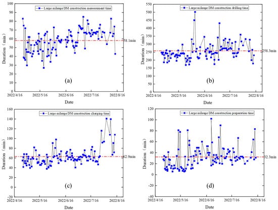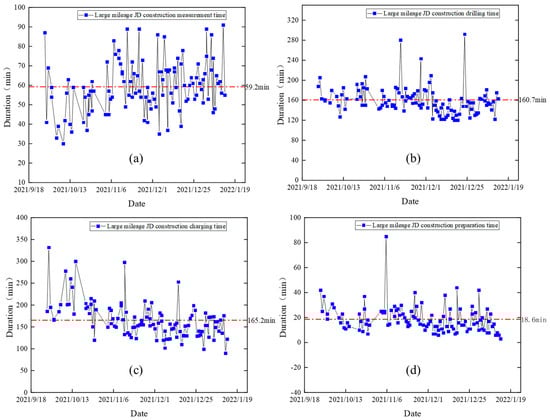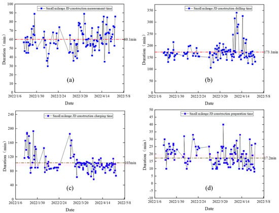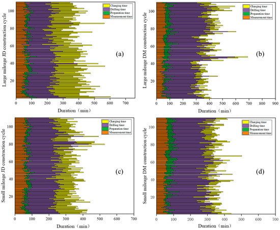 The duration of construction process is further subdivided into four indicators, specifically: measurement time A21, drilling time A22, loading time A23, and preparation time A24. Duration of construction process is the time consumed from the beginning to the end of the tunnel construction using the drilling and blasting method. Obviously, the smaller its value, the higher the construction efficiency. Let T1 indicate the start moment and T2 indicate the end moment; then, the duration of construction process can be expressed as follows: