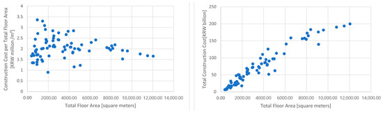 Construction cost per total floor area according to total floor area (left), total construction cost according to total floor area (right).