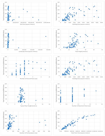 The relationship between each building general property and total construction cost is shown in Figure 3.