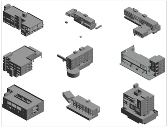 In order to extract BIM properties for predicting construction costs, 78 BIM models including objects such as room walls, floors, columns, stairs, windows, and doors were modeled using 2D drawings. The newly created BIM models are shown in Figure 4.