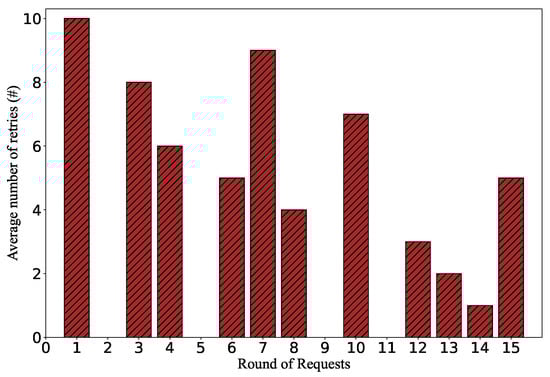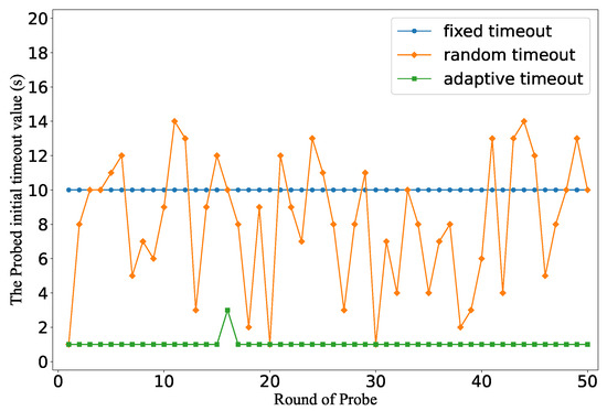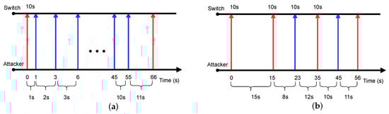 In Figure 4a, the incremental search method returns a minimal value. This is because the third probing packet, which is sent 2 s after the previous one, triggers the first table-miss after the rule installation. Therefore, the probing procedure falsely reports the timeout value is 1 s, which is actually the value of . If the packet interval in the following attacking phase is such a small value, the attack cost can be very high. According to the calculation in [10], the attacker must generate attack traffic with a rate of at least 1000 pps to overflow the flow table with a capacity of 1000.