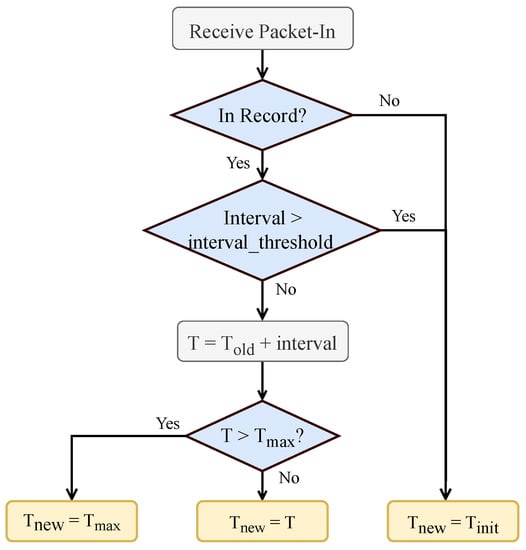 To achieve a quick response, the logic of timeout calculation is always straightforward. We summarize the basic idea of adaptive timeout mechanisms and present it in Figure 3. Here, is the initial value for new flows, is the maximum timeout to avoid infinite growth, is a constant number to avoid assigning large timeouts for repeated short flows, and “” represents the time interval between the current packet-in and the last Flow-Removed event.