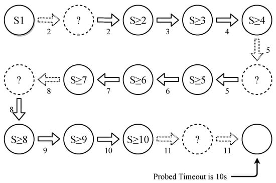 Based on the summary, the timeout value becomes predictable. The maximum timeout in most adaptive timeout mechanisms is usually less than 15 s [15,28], and the OpenFlow protocol only accepts integer timeouts in seconds. Thus, we can model the timeout value of flow rules using a finite-state machine (FSM). Here, the state of the flow rules is its idle timeout value. The initial timeout value is the initial state, and the target value () can be the end state. Since only an unmatched packet can cause the new rule installation with a newly calculated timeout (i.e., state transition), the transition actions are triggered by the packets that are sent after the flow rule expires. The state transition is determined by the time interval between the last hit time of the flow rule and the probing packet that triggers the table-miss. When reaching a certain state, we send a probing packet with a packet interval larger than its timeout value as an action. To obtain the new state (output), we can use the search_timeout operation to infer its exact timeout value. In this way, a transition path between the two states is constructed. Then. we change the packet header fields, generate another flow and transit the corresponding flow rule state to this state. By repeating the process, we can find the transition paths from this state to other states. Figure 6 gives an example. The packet interval time is presented above the arrow.