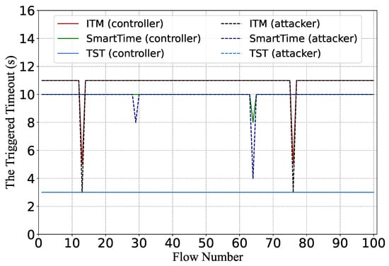 Several studies have criticized the fixed timeout setting and proposed adaptive timeouts [15,18,21,41] considering flow characteristics. Intelligent Timeout Master [15] assigns idle timeouts based on the flow characteristics and the current flow table occupation. HQtimer [16] uses a Q-learning-based mechanism to decide the timeout value. Zhang et al. [21] proposed methods based on real-time traffic monitoring. An analysis of different dynamic timeout is reviewed in [41].