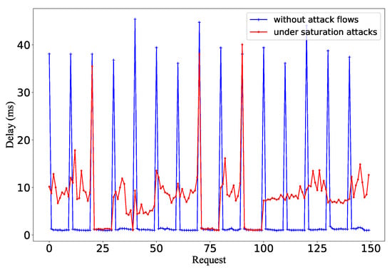 Algorithm 2 shows the pseudocode of this process. After generating a flow rule, the attacker sends a packet and uses compare_timeout () to compare the timeout value with . If the flow rule has a larger timeout than , this attack flow can move to the next phase. Otherwise, the testing packet reports a large RTT, and the attacker needs to retry. The attacker repeats the process several times to filter. However, the repeated process of the same flows can produce packet-in requests with a fixed inter-arrival time (i.e., ), which may expose the attack pattern. So, we use an upper boundary to limit the number of repeated processes.