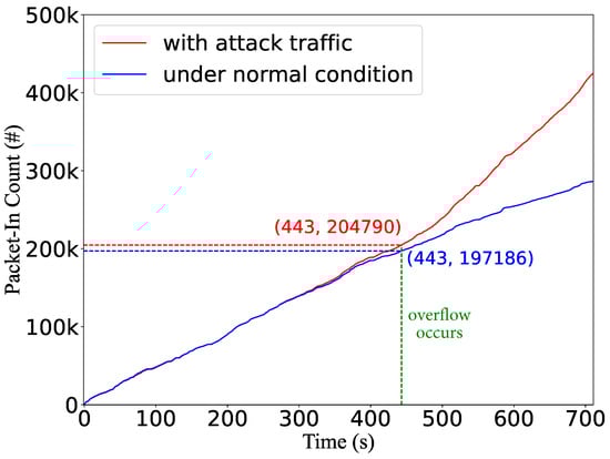 (1) Packet-In rates: We measure the number of packet-in messages sent to the controller with and without the attack. As shown in Figure 23, before the flow table is full (around 250 s), there is no noticeable difference between the packet-in rates for the two scenarios. After the flow table is overflowed by malicious flows, the packet-in rate increases. Compared with the table-miss attack [36], which targets saturating the control channel between the control and data planes, the flow table saturation attack incurs only a few additional packet-in messages. Even after overflowing the flow table, most packet-in requests are caused by benign flows. Therefore, existing defense mechanisms against the controller saturation attack cannot react to the flow table saturation attack.