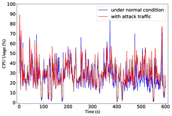 The CPU utilization of the Ryu controller under attack and normal conditions.