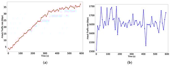 The traffic rate of benign flows: (a) the traffic rate of attack flows; (b) the traffic rate of benign flows.