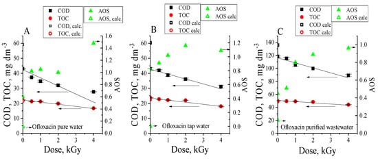 COD, TOC, and AOS values as a function of absorbed dose in 0.1 mmol dm−3 ofloxacin solutions in pure water (A), tap water (B), and purified wastewater (C) matrices.