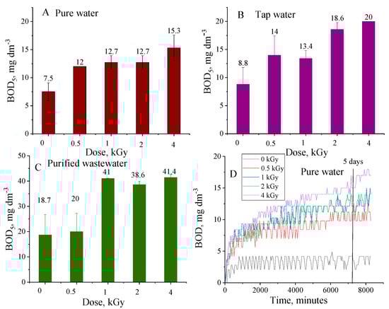 BOD values in 0.1 mmol dm−3 irradiated and nonirradiated ofloxacin solutions in pure water (A), tap water (B), and purified wastewater (C) matrices. Time dependence of BOD values at different doses in pure water (D).