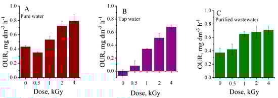 The effect of degradation products on the metabolic activity of a mixed microbial population was investigated in oxygen uptake rate measurements (OUR, Figure 3). Similarly to BOD, this test also uses activated sludge with a complex mixture of bacterial species. However, OUR measurements take only three hours, whereas BOD measurement is at least five days long. The number of microorganisms used in the OUR test is around two orders of magnitude higher than the initial number of microorganisms in BOD measurement. However, this number does not change during OUR measurement; microorganisms have no time for producing extracellular enzymes, and they cannot multiply either, while at the end of the five-day measurement, the number of microorganisms in BOD measurement is two orders of magnitude higher (four orders of magnitude compared to the starting solution) than in the OUR test. Therefore, in OUR measurements, only the readily biodegradable compounds are digested. In pure water, the blank solution containing activated sludge had an OUR value of 0.70 mg dm−3 h−1. When ofloxacin was added to the blank solution, the OUR value increased to 1.13 mg dm−3 h−1. The value corrected with the blank is 0.43 (in Figure 3 the corrected values are shown). The corrected values increased at higher doses compared to the unirradiated one, showing more intensive metabolic activity in the treated samples in agreement with the results of the BOD5 measurements. The values indicate that the degradation products not only are nontoxic, but they used as a source of nutrients by the microbes.