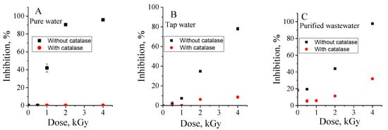 No toxicity to V. fischeri was observed in nonirradiated solutions (see in Figure 5). When the irradiated solution was introduced into the test mixture, high toxicity was observed, growing up to 100% luminescence inhibition at a 1–2 kGy dose. This high inhibition was certainly due to the effect of H2O2 forming during radiolysis [22,23,24]. However, when H2O2 was removed by using the enzyme catalase (recommended by Zona and Solar, [38]), no or only minor inhibition was detected. These experiments show that the degradation products were either nontoxic or exhibited just a small toxicity to the test bacteria. The toxicity can be eliminated by properly selecting the absorbed dose [3,12].