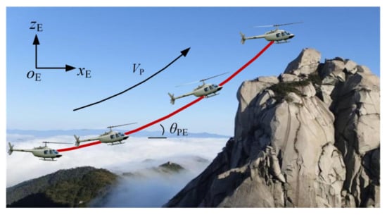 According to the right-hand rule of the frame system, an earth-fixed inertial frame () is defined at an arbitrary reference point () on the ground, with the axes , and toward the respective east, north, and vertical up. Following this, a flight-path frame () and a body frame () are then defined at the helicopter center of gravity (), with the axis toward the direction of flight velocity vector and the axis toward the helicopter nose, and parallel to the cabin floor. Figure 1 shows these definitions of the frame system, where is the Euler angle between frames and . also indicates the sideslip angle of the helicopter, and and are the yaw angle and climbing angle of the flight path relative to frame , respectively, which can be written as a vector form of for convenience.