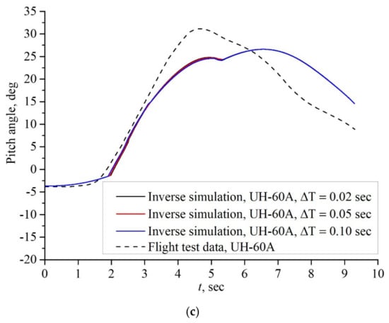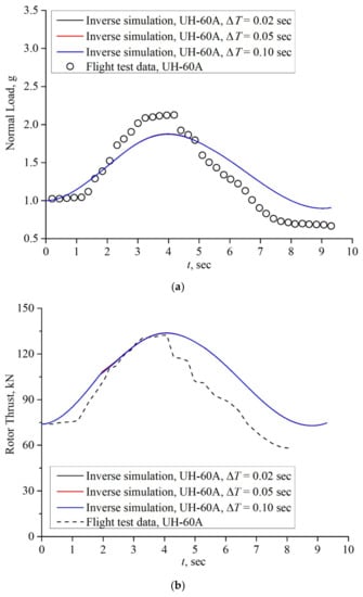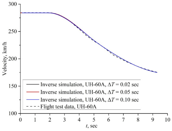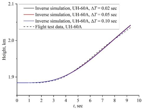 To illustrate the numerical stability of the degenerated method, three simulation time steps (i.e., s, s, and s) are adopted. The primary results are shown in Figure 3, Figure 4, Figure 5 and Figure 6, and indicate that our method has good numerical stability and robustness, because the results are independent of these simulation time steps. The inverse simulation results regarding the maneuvering flight height and velocity are shown in Figure 3 and Figure 4. Corresponding flight test data are also shown in these figures. It can be concluded that the inverse simulation results are in good agreement with the flight test data. Thus, the prescribed boundary conditions outlined in Table 2 can describe well the flight path of the pull-up maneuver.