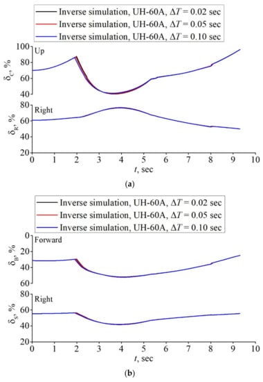 One advantage of the method is that it can invert the helicopter model, and simulate almost any maneuver in the longitudinal, lateral, and directional channels, and even any maneuver in the three-dimensional space, by introducing a transitional vector that can express the output and state vectors at the same time. Thus, our method has good versatility. In addition, because the present results are independent of simulation time steps, and the results of the time histories of the cockpit controls have no high-frequency oscillations (HFOs), our method also demonstrates good robustness. However, there are still two derivatives of Euler angles that cannot be directly expressed in explicit forms; thus, these angles have to be expressed numerically, using a differentiation-based approach.
