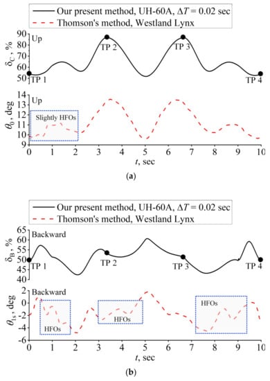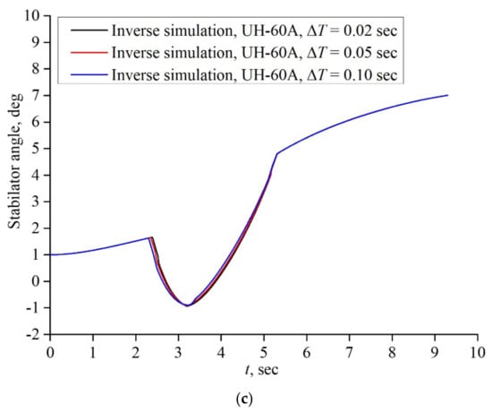 In addition, the stabilator of the helicopter (i.e., the flexible horizontal tail) is controlled automatically by the flight control system, and depends on the flight velocity; and the collective controls the stabilator angle changes, from 1.0 deg to approximately 7.0 deg, during the whole pull-up maneuver, to provide an additional pitch moment for the helicopter. Note that the increase in the stabilator angle generates a pitching-down moment, while the decrease in the stabilator angle generates a pitching-up moment. Thus, the evident phenomenon is that the minimum value reaches approximately −1.0 deg when entering the maneuver (in this case, the helicopter needs a pitching-up moment, to quickly increase the pitch attitude), and the angle needs to be gradually increased when recovering from the maneuver (in this case, the helicopter needs a pitching-down moment, to restrain the increasing trend of the pitch attitude). Our method and the inverse simulation results illustrate this phenomenon well.