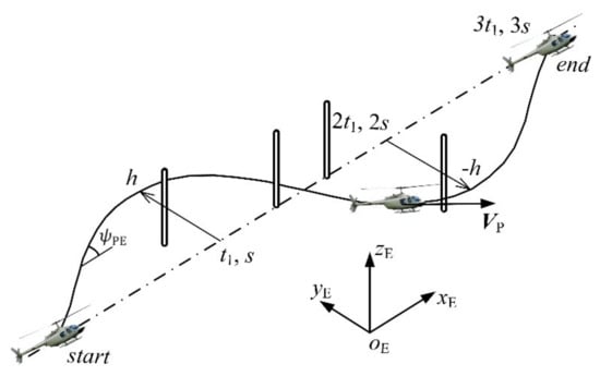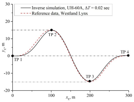 The slalom maneuver is described in the ADS-33 requirements document [37]. It is an instantaneous right-to-left or left-to-right turning maneuver in the horizontal plane. It also initiates level, unaccelerated flight, and lines up with the centerline, and is followed by a smooth turn to the left, followed by one to the right. According to the ADS33 requirements, the turns will be at least 50 ft (15.24 m), with a maximum lateral error of 50 ft (15.24 m), and the flight velocity through the maneuver must not be less than 40 knots or 60 knots (74.08 km/h or 111.12 km/h), respectively. In this case study, an idealized slalom maneuver proposed by Thomson [7] was conducted, to illustrate the degeneration method, but we used the UH−60A helicopter, instead of the Westland Lynx helicopter mentioned in Thomson’s article. The maneuver lasted for 10 s, the total distance was 300 m (, Figure 7), the lateral displacement, , was 15 m, and the flight velocity, , was 60 knots (111.12 km/h).
