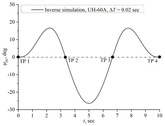 The primary results of the inverse simulation are shown in Figure 8, Figure 9, Figure 10 and Figure 11, and the simulation time step is selected as 0.02 s. Because, at present, there is a lack of flight test data and reference data of the UH−60A flying this idealized slalom maneuver, some of our results were compared with the inverse simulation results concerning the Westland Lynx helicopter flying the idealized slalom maneuver in Thomson’s literature [7]. Figure 8 shows the flight path, which indicates that the results are in good agreement with each other, although they involve different helicopter systems. The results of the prescribed variable, , are shown in Figure 9. In the process of the slalom maneuvering flight, the maximum lateral displacement reached 15 m, which met the requirement of this idealized slalom maneuver. The positive maximum yaw angle was above 15 deg, and the negative maximum yaw angle was below −25 deg.