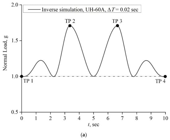 The pull-up maneuver only involves the elements in the longitudinal channel; i.e., and in the transitional vector . Thus, these directional elements and can be set as zero in the whole time histories. The boundary conditions of the time histories and are shown in Table 2. In detail, four time points of and two time points of are used to prescribe, according to the nature of this pull-up maneuver. Here, because the transitional element is a rate variable, the displacement variable is also used to follow the definition of the polynomial scheme, i.e., Equation (8). The boundary value of of time point 1 (i.e., the start) can be set as zero, and its values at the other time points are not necessary, because they can be inherited from the previous calculation stage.