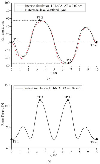 The time histories of the normal load factor, roll angle, and rotor thrust are shown in Figure 10. In particular, the roll angle is compared with Thomson’s inverse simulation results. These also match well with each other. In the process of the slalom maneuvering flight, the maximum normal load reached approximately 1.7 g, and the maximum rotor thrust reached approximately 130 kN.