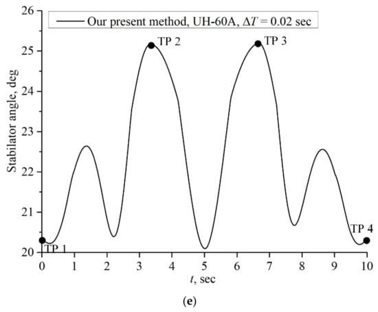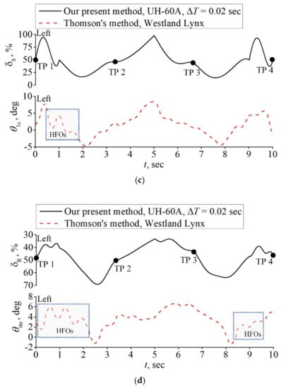 Figure 11 shows the time histories of the cockpit controls and the stabilator angle during the slalom maneuver. The controls (i.e., collective pitch , longitudinal cyclic pitch , lateral cyclic pitch , and tail rotor collective pitch ) of Thomson’s inverse simulation results are also shown in Figure 11, to discuss the fidelity of our inverse simulation results. The changing trends of the controls are consistent with each other, although the helicopter system was different. More importantly, because our results for the time histories of the cockpit controls, which can be seen clearly in Figure 11a–d, have no high-frequency oscillations (HFOs), our method seems to be more robust than Thomson’s method [7]. It can also be noted that to realize a slalom maneuver, primary control (i.e., the lateral cyclic stick) is required. In particular, the helicopter initially rolled to the left (negative roll angle, see Figure 10b), due to an initial pulse of the lateral cyclic equivalent to a nearly full deflection of the stick. This phenomenon is consistent with Thomson’s results. In addition, the stabilator angle changed from approximately 20 deg to approximately 25 deg during the whole slalom maneuver, to provide an additional pitch moment for the helicopter. However, the changing range is smaller than that in the pull-up maneuver (i.e., Case I), due to the constant value of the flight velocity.