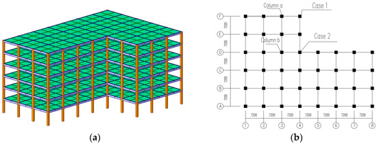 Schematic diagram of irregular frame structure: (a) structural elevation diagram; (b) floor plan and locations of damage cases (A–F, 1–8 represents the number of the central axis in the plane. Case1 and Case2 are the positions of the failure columns in the plane. Columns a and b represent adjacent columns of the failed column).
