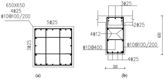 The model uses PKPM to build a 6-story-frame office building, as shown in Figure 1b, whose plane structure is L-shaped, with main beams and secondary beams arranged at intervals. The longitudinal and transverse spans are 7.2 m, the height of the first floor is 5.10 m, and the other floors are 4.2 m. The reinforcement and beam-column cross-section are selected in accordance with China’s Concrete Structure Design Code (GB 50010-2010) [19], where the main beam cross-section size is 300 mm × 600 mm, the secondary beam is arranged between the two main beams and the secondary beam cross-section is 250 mm × 450 mm. The first-floor column cross-section is 650 × 650 mm, and the standard floor column cross-section is 650 mm × 650 mm. The live load of the floor and roof slab is 2.0 KN/m2, the constant load is 5.0 KN/m2, the floor beam load is 7.5 KN/m, the ground roughness category is B, the modified basic wind pressure is 0.4 KN/m2, the seismic category is C, the seismic grouping is Group I and the damping ratio of the structure is 0.05. The intensity of protection is 6 degrees. The thickness of the protective layer of beams is 25 mm and that of columns is 30 mm. The reinforcement of the simulated failed first-floor columns is shown in Figure 2a. Column F4 represents the column where axis F intersects axis 4, and D4 represents the column where axis D intersects axis 4. The reinforcement of the main beam adjacent to the failed column is shown in Figure 2b. See Table 1 for reinforcement information.