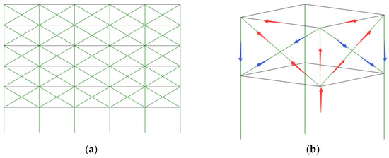 Model 1: three-dimensional diagram (a); force transfer diagram of steel truss (The red arrow represents the incoming force of the steel truss; The blue arrows represent the force coming out of the steel truss.) (b).