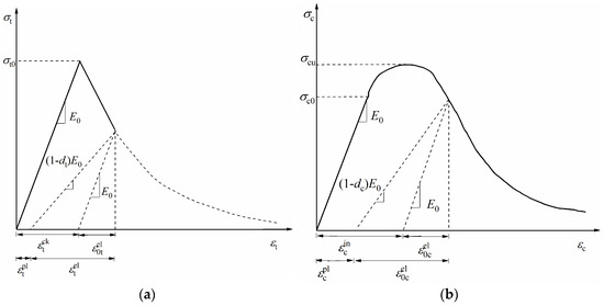 Stress–strain relationship of plastic models of tensile and compressive damage of concrete: (a) tensile damage; (b) compression impairment.