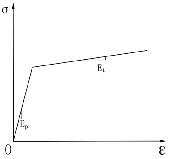 For the HRB400 steel bar material, the design value of the steel bar yield strength fy = 360 N/mm2, the standard value fyk = 400 N/mm2, and the elastic modulus of the steel bar Es = 2 × 105 N/mm2. In the process of software modeling, the ideal elastic–plastic double-fold model without a yield point is selected according to the stress–strain curve of reinforcement under monotonic loading in the specification [19]. The model does not take into account the fracture of steel bars, which is consistent with the fact that there is no fracture in the steel bars during the test. This model has good applicability in reflecting the yield and strengthening stages of ordinary reinforcement, and its reinforcement constitutive model is shown in Figure 6. EP = 2.06 × 105 N/mm2 is the elastic modulus of the steel bar in the ideal elastic–plastic bifold model without a yield point. Et = 0.01 EP is the elastic modulus of the strengthening stage.