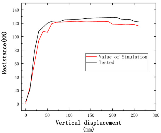 The simulation value obtained with the loading method by the simulation research team was compared with the experimental data, as shown in Figure 9. By comparing the experimental data with the simulated data, the curve fitting degree is good and the error is within a reasonable range, which indicates the feasibility of the finite element modeling method and parameter selection.