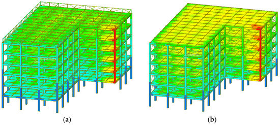 Structural displacement nephogram of column removal at concave corner: (a) add steel trusses to the roof of Model 1; (b) X-tension reinforcement is added to Model 2 structure.