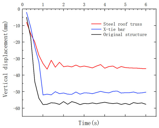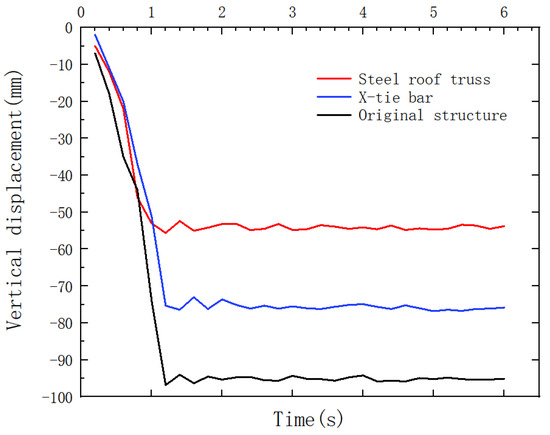 The vertical displacement development trend of each model is consistent with the original model. By comparing the vertical displacement above the failure column with the convex-corner column in the balance, we can see that adding a steel truss to the roof can reduce the vertical displacement caused by the failure of the corner column more effectively; additionally, adding X-tie strengthening to the structure can also reduce the vertical displacement caused by the failure of the corner column, but the effect is not as significant as the former.