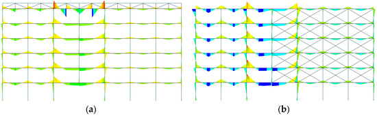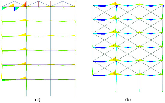 The bending moment diagram of F-axis 5 s after column F4 is removed: (a) is the bending moment diagram of Model 1; (b) is the bending moment diagram of Model 2.