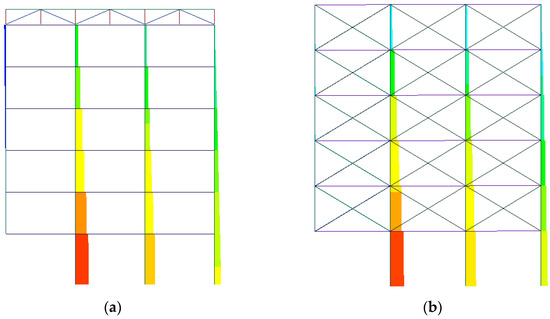 Axial force diagram of F-axis 5 s after column F4 is removed: (a) is the axial force diagram of Model 1; (b) is the axial diagram of Model 2.