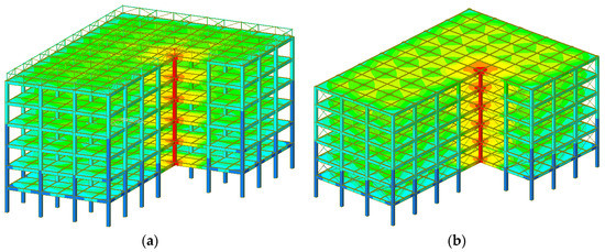 Displacement nephogram of structure at convex-corner column-removal condition: (a) Model 1 with roof-added steel trusses; (b) X-tension reinforcement is added to Model 2 structure.