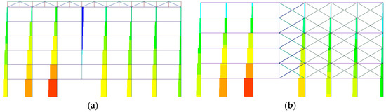Axial force diagram of D-axis 5 s after column D4 is removed: (a) is the axial force diagram of Model 1; (b) is the axial diagram of Model 2.