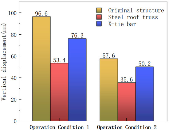 - When working condition 1 occurs, the vertical displacement of the failure column of the steel roof truss structure decreases most obviously, decreasing by 44.7%. The vertical displacement of the failure column of the X-tension reinforcement structure is reduced by 21.1%. This indicates that both the steel truss and X-tension strengthening can create a new transmission path for the resistance, and can share a part of the resistance of the beam, transfer the internal force of the failed column to the adjacent column, and improve the anti-collapse ability of the structure. However, the best transmission effect is achieved by adding a steel truss to the roof.