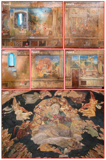 The Italian painter Saturnino Gatti was known for his exceptional technique, composition, and use of color in his frescoes during the late 15th and early 16th centuries [1]. The Church of San Panfilo in Villagrande di Tornimparte (AQ, central Italy) is home to a significant example of his work, which is of considerable importance in the context of Italian cultural heritage [2]. The church is located in an area hit by the catastrophic earthquake of L’Aquila in 2009, but did not suffer any serious damage, contrary to many other buildings of historical and cultural significance. Studying the building, along with the artworks contained in it, will aid in its conservation and restoration [3,4].