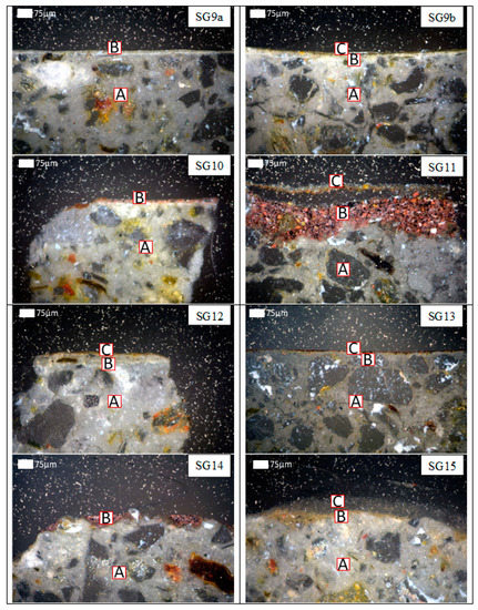 Microphotographs of thin sections of the samples SG9a, SG9b, SG10, SG11, SG12, SG13, SG14, and SG15. The capital letters “A”, “B”, and “C” indicate the different layers visible in cross-section, with “A” being the innermost (the plaster) and the others (mostly pigmented) ordered by decreasing depth.