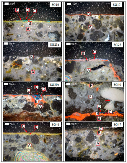Microphotographs of thin sections of the samples SG16, SG17, SG23a, SG25, SG39b, SG40, SG46, and SG47. The capital letters “A”, “B”, “C”, “D”, “E”, and “F” indicate the different layers visible in cross-section, with “A” being the innermost (the plaster) and the others (mostly pigmented) ordered by decreasing depth. Sample SG40 shows a break between the layers consisting of highly purified plaster (E) in which remnants of a blue pigment can be seen (indicated by the red arrow), probably due to the use of a dirty brush or the mixing of pigments from the underlying layer (D).