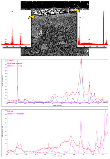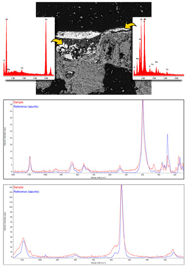 The sample from Panel D (SG25) again has red ochre (hematite with some parts of magnetite) as the pigment originally used for the “a fresco” layer. The upper layer, probably applied “a secco”, is blue and made of a combination of ultramarine and Ti white, suggested by the detection of the phases lazurite and rutile; some broad Raman peaks (from about 1300 to 1500 cm−1) also point out the presence of organic matter. The SEM microanalyses also revealed the presence of baryte. Finally, another layer, differently oriented in respect to the others (that is, not observed on the surface but sinking into the plaster), is formed of S and Ca (gypsum?) and covers an inner thin red film; although this has the same color as the red ochre layer and is also in direct contact with the substrate, its composition is slightly different, with frequent SEM-EDS signals of Fe, Pb, and Ba from baryte.